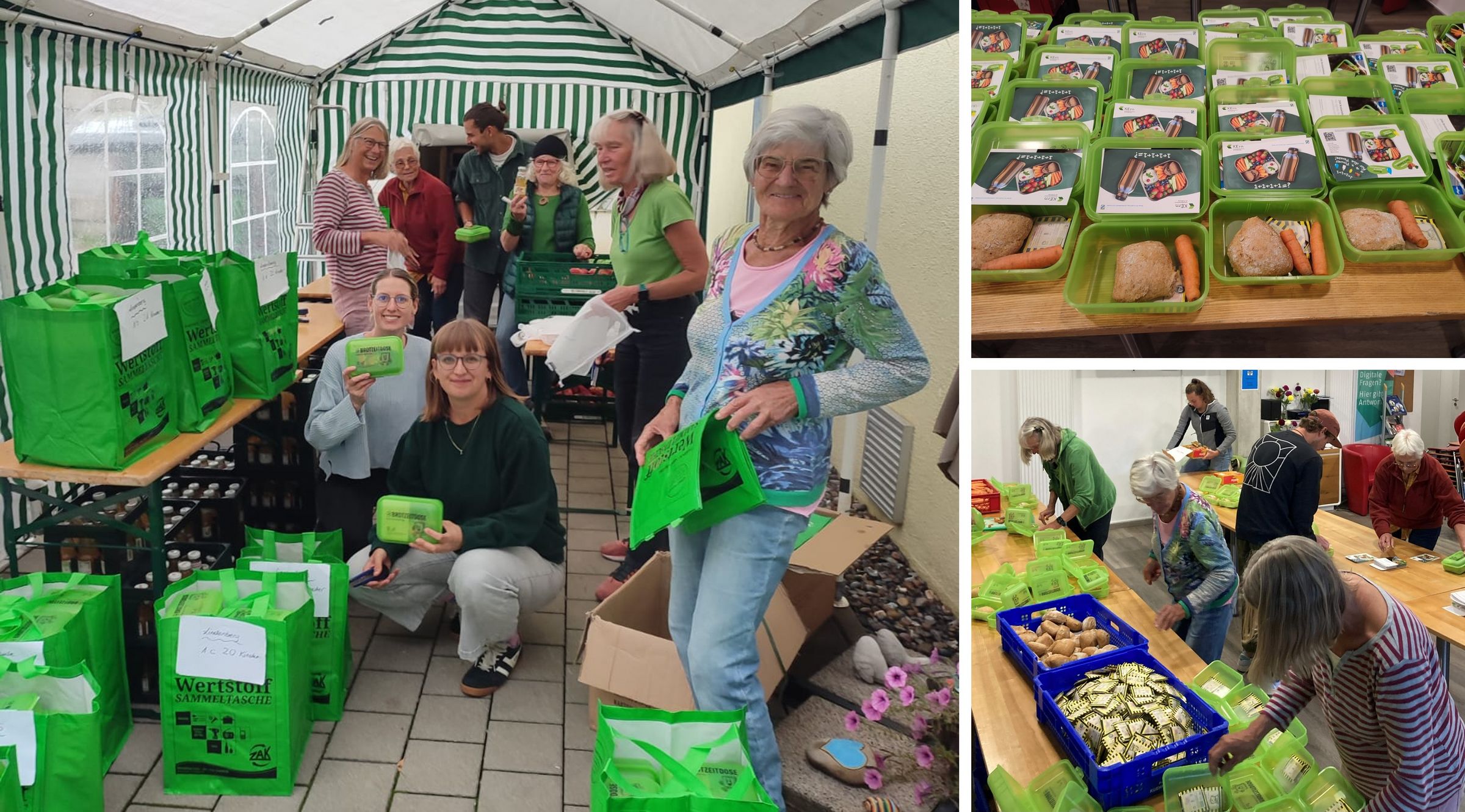An unserem „Packtag“ herrscht rege Geschäftigkeit im Treffpunkt Zech. Linda Schemm, Leiterin des Treffpunkt Zech e.V. begrüßt die Verantwortlichen der Bund Naturschutz Kreisgruppe Lindau und des ZAK, sowie viele fleißige HelferInnen, die hier im Raum des Treffpunkt Zech ein gesundes, regionales und leckeres Pausenbrot zusammenstellen dürfen. Die Zutaten dafür wurden überwiegend von lokalen Obsthöfen, Läden, Bäckerei und den Lindauer Fruchtsäften gesponsert (siehe unten). Neben Apfel, Karotte, Vollkornsemmel und einer kleinen Süßigkeit gibt es außerdem noch Tee und eine kleine Flasche Bio-Apfelsaft dazu. Alles zusammen wurde dann mit koordinierten Handgriffen von den tüchtigen Helfenden in die wiederverwendbare Bio-Brotbox des ZAK gepackt, um dann an alle ErstklässlerInnen im Landkreis Lindau verteilt zu werden. Mit diesem Projekt wollen wir auf den hohen Stellenwert einer gesunden Ernährung aufmerksam machen, die gut für uns und unsere Kinder ist und gleichzeitig durch regionale Bio-Lebensmittel und eine umweltfreundliche Verpackung schonend mit den Ressourcen unserer Umwelt umgeht. Den SchülerInnen und Schülern wünschen wir für Ihren Start in die Schulzeit viel Erfolg und bedanken uns herzlich bei den Sponsoren, UnterstützerInnen und den vielen ehrenamtlichen HelferInnen, die diese Aktion möglich machen.